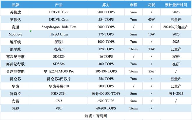 此外,包括芯馳科技、黑芝麻智能、寒武紀(jì)行歌、百度昆侖芯等企業(yè)也均推出了大算力智能駕駛芯片。我們簡單整理了這些產(chǎn)品并匯集為表格。
